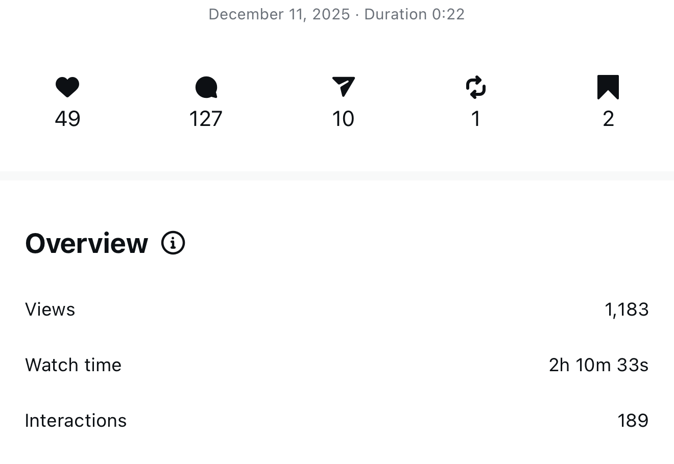 Results: First edited reel posted: FIVE TIMES HER NORMAL REACH! 1,500 views in 24hrs (compared to average 90–300)